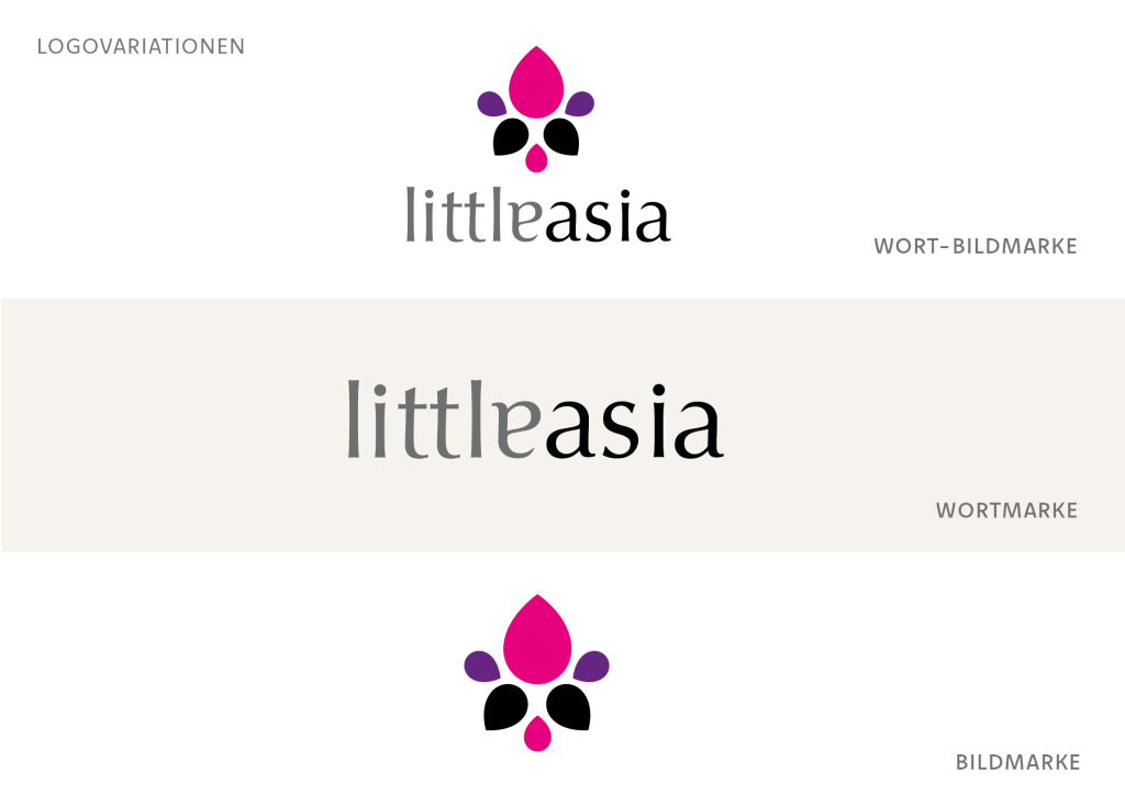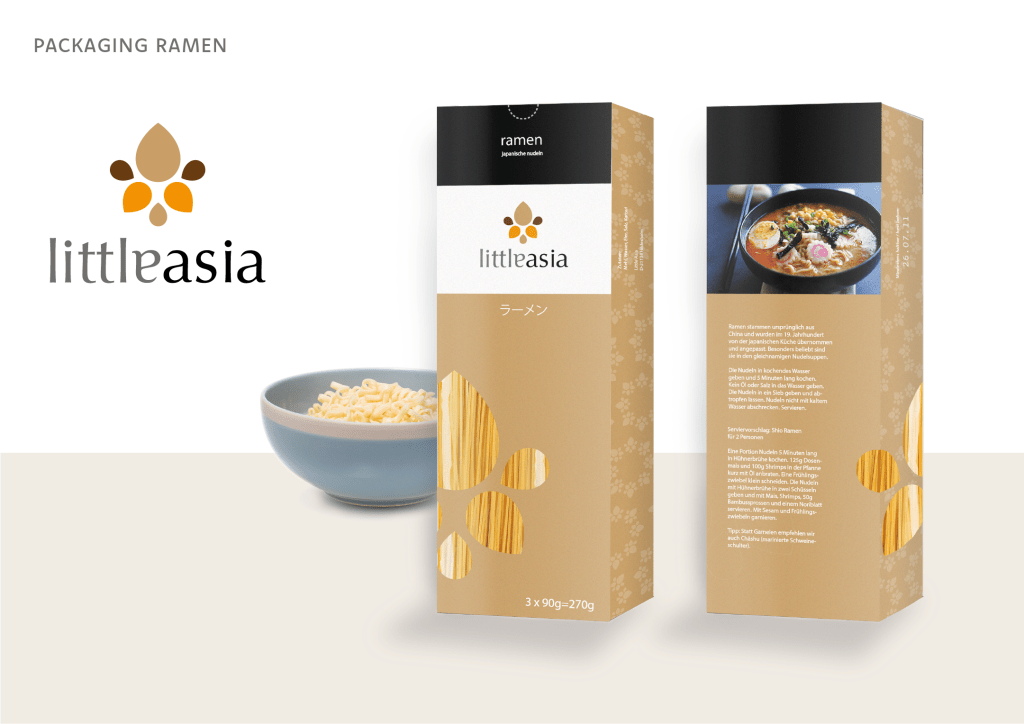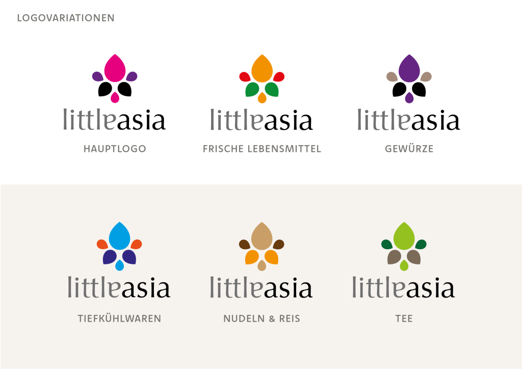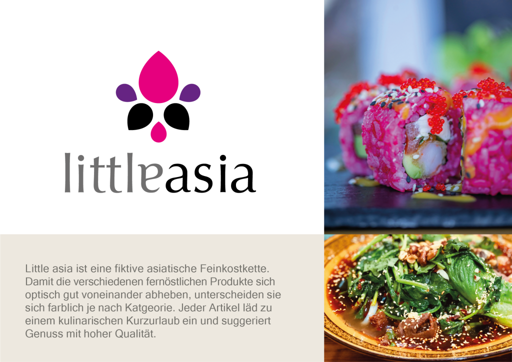 Little asia ist eine fiktive asiatische Feinkostkette. Damit die verschiedenen fernöstlichen Produkte sich optisch gut voneinander abheben, unterscheiden sie sich farblich je nach Kategorie. Jeder Artikel läd zu einem kulinarischen Kurzurlaub ein und suggeriert Genuss mit hoher Qualität.