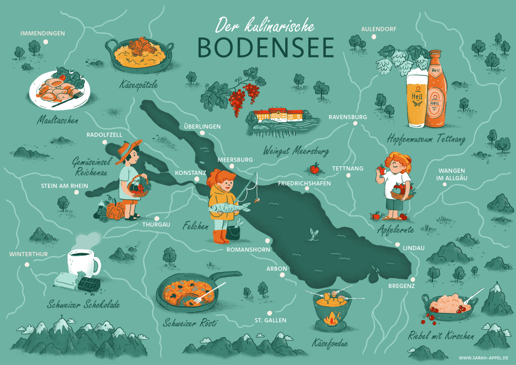 Diese illustrierte Landkarte zeigt den Bodensee und umliegende Städte. Doch statt einer geografischen Landkarte liegt der Fokus hier auf den regionalen Speisen und gastronomischen Highlights der Region.