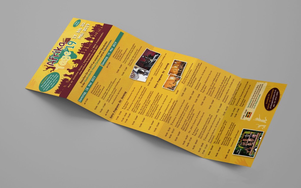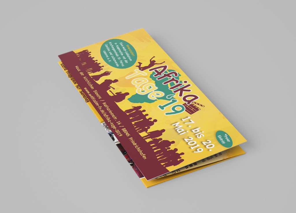 Die Afrika Tage sind eine jährlich stattfindende Benefizveranstaltung in Friedrichshafen, die vom Verein Eine Welt Friedrichshafen e. V. und Namibiakids ausgerichtet wird. Seit 2017 erstelle ich hierfür die Flyer und Plakate. Das Logo auf den Printmedien wurde ebenfalls überarbeitet.