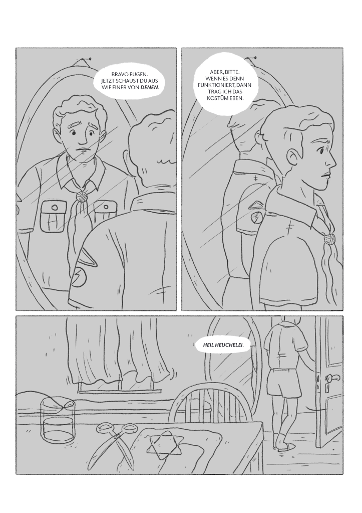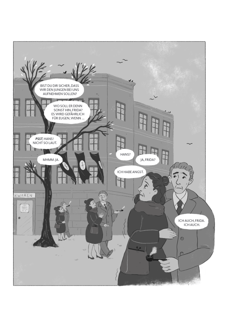Die Graphic Novel erzählt von Eugens Jugend im nationalsozialistischen Berlin, seinem Leben im Untergrund, seinem Widerstand gemeinsam mit Werner Scharff sowie seiner Inhaftierung und Befreiung 1945 an seinem 19. Geburtstag. Neben dem historischen Hintergrund ist das Projekt für mich besonders relevant, weil es hochaktuelle Fragen nach Zivilcourage, Menschlichkeit und dem Umgang mit Ausgrenzung und politischer Radikalisierung stellt – Werte, die ich mit meiner Arbeit sichtbar machen möchte.