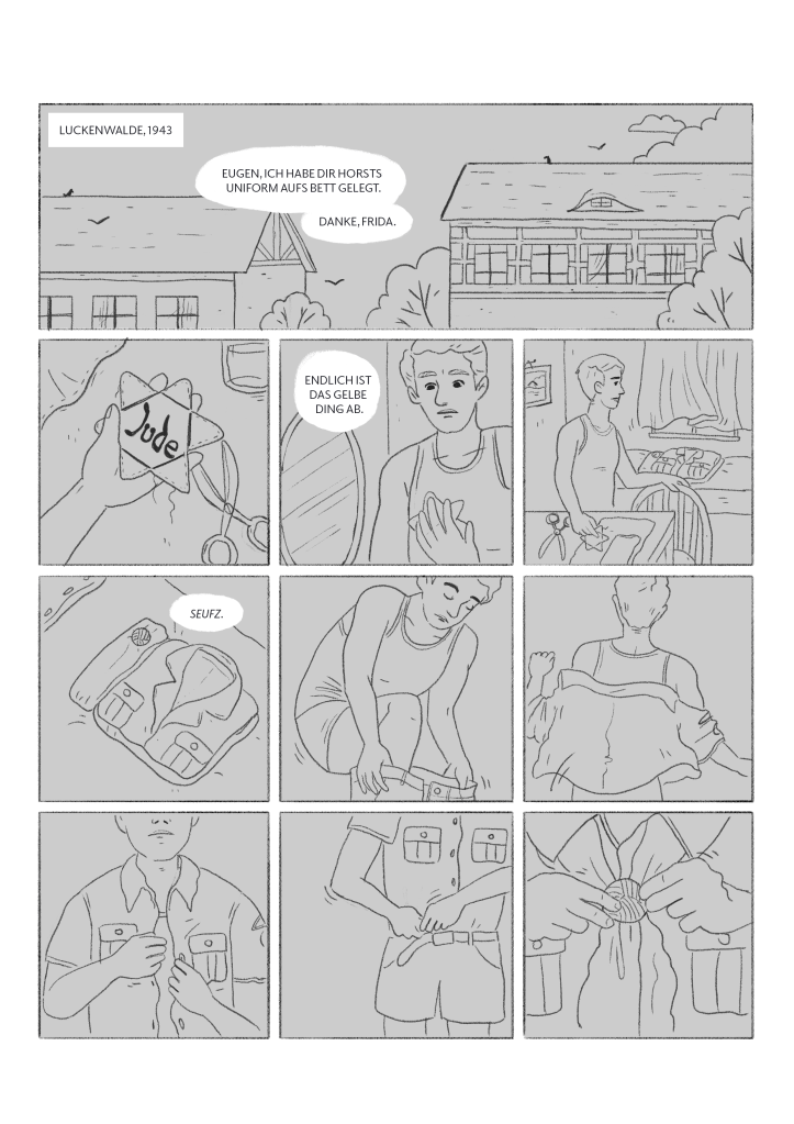 Für die Graphic-Novel-Ausschreibung der Gedenkstätte Stille Helden habe ich Comics zur Überlebensgeschichte von Eugen Hermann-Friede entwickelt. Eingereicht habe ich für die erste Bewerbungsrunde einen zweiseitigen Comic als Skizze, einen Cover-Entwurf sowie eine vollständig ausgearbeitete Comicseite. Nach der ersten Auswahlrunde wurde mein Projekt unter die Top 10 Finalisten gewählt.