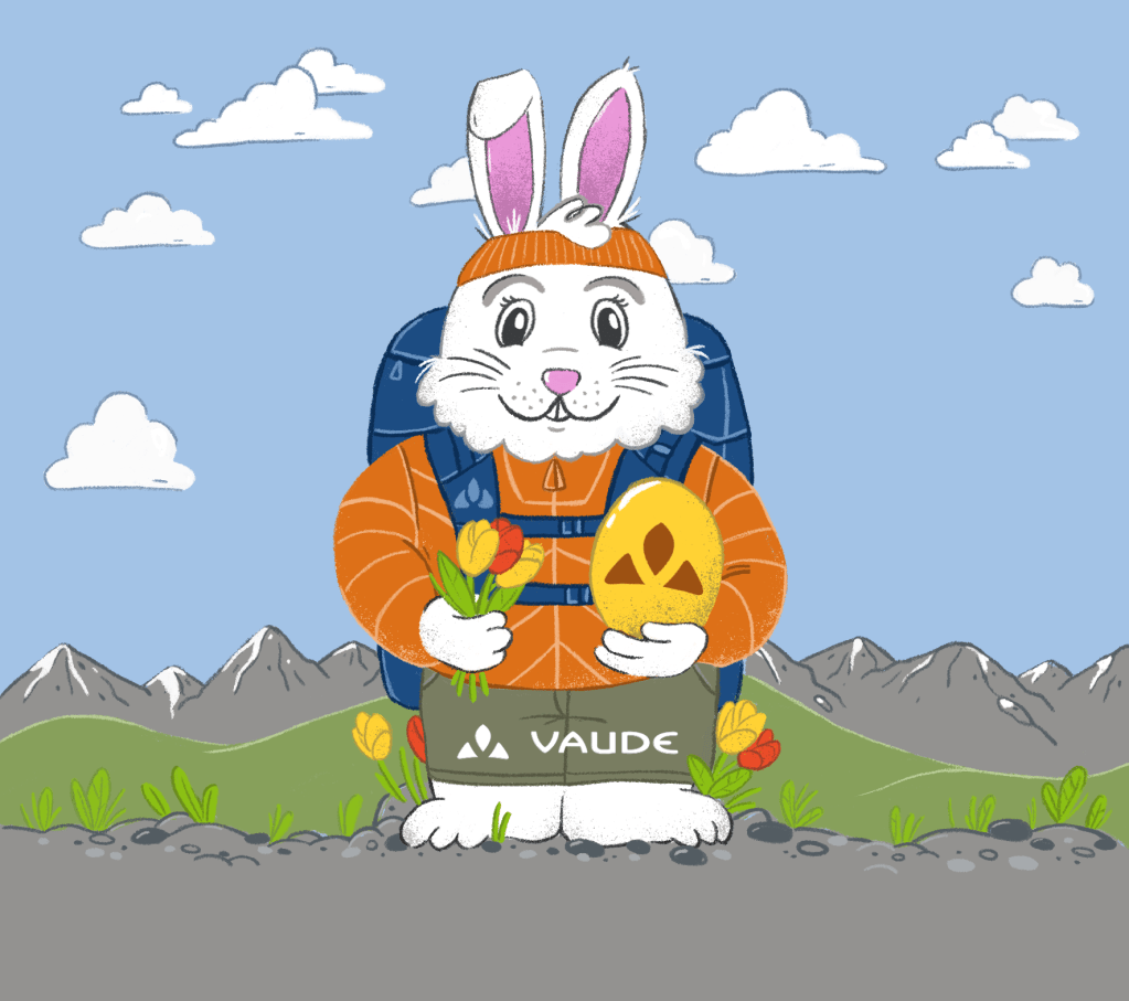 Die Herausforderung bestand darin, die fröhliche Osterstimmung mit der Markenwelt von VAUDE zu verbinden: naturverbunden, aktiv und detailverliebt. So entstand ein sympathischer Charakter, der sowohl Kinder als auch Erwachsene anspricht – und gleichzeitig die Identität des Unternehmens transportiert.